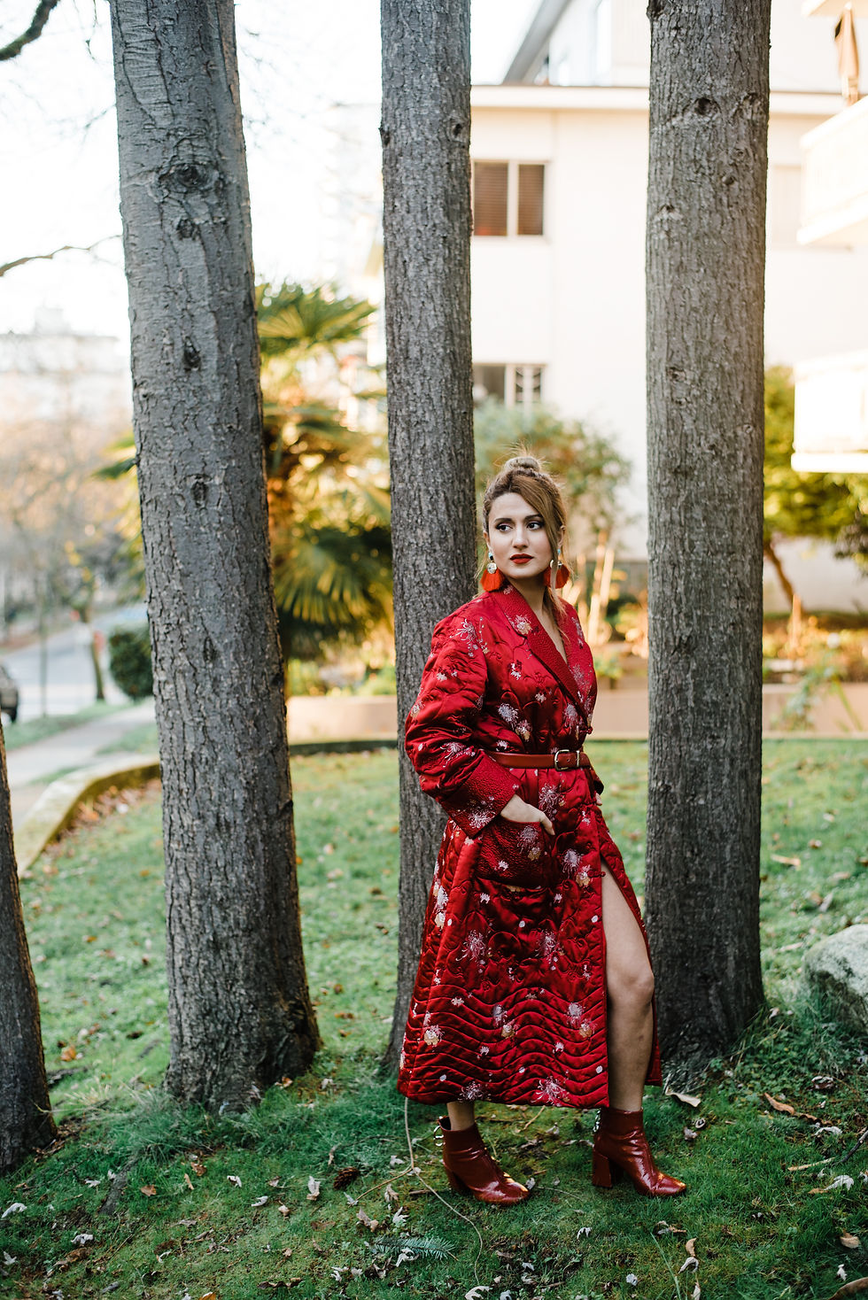 For my second look, I paired a long quilted oriental jacket from Front and Company, one of my favorite consignment stores in Vancouver, with a vintage red and gold belt to make it more form fitting. To add more excitement to the look, I also matched the coat with two oversize statement earrings and red leather ankle boots. I am in love with all shades of red and during the holiday season, I go all the way and incorporate red in all of my looks. Specially with the grey and gloomy weather in Vancouver during the winter I find that wearing warmer and bolder colours make you stand out and more cheerful! Make sure to check out my Hot Red Favourites on the top!
